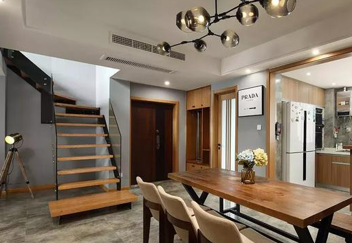 餐厅位于一层的中间位置,开放式厨房相邻。餐厅客厅一体化让空间得到充分的利用,少了墙壁、隔板的阻碍,这些空间得到了进一步的利用,让厨房不显得拥挤,也让客厅变得更宽阔。