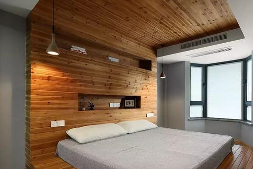 卧室配色简洁、设计简约的同时,更有着叫人眼前一亮之感。巨大的C字型木面将一片天花板、床头墙和地板从灰色中释放出来,不仅视觉上有着令人惊艳的冲击力,营造出森林环绕的意境,颇具斯堪的纳维亚半岛上传统木屋的粗犷与恣意,还颇具生态、环保等健康功能。