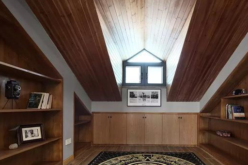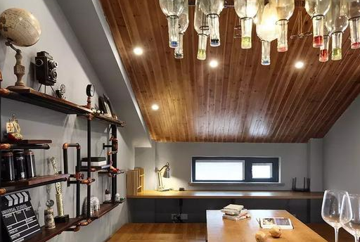 不过设计师将整个屋顶都以实木条覆盖起来,因而木纹色的比重非常高,也更令人有如置身于木屋中的错觉。在功能上,这里集合了吧台、榻榻米、长桌以及地毯等区域,堪称partyanimals的天堂,而榻榻米下巨大的储物空间,更是本案保持简洁的一大秘密武器。