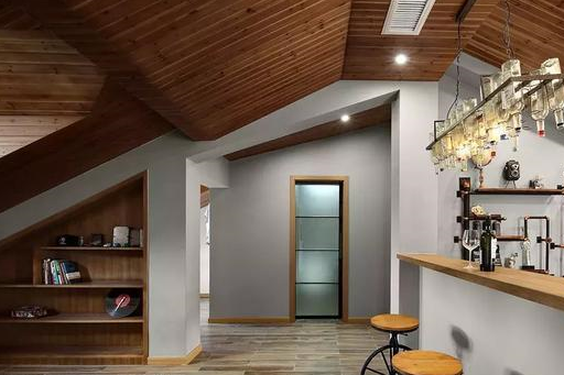 按照业主的实际需求,改造成了酒吧和聚会、开party的绝佳去处。同时,色彩上延续了一楼风格,以灰色搭配木纹色。