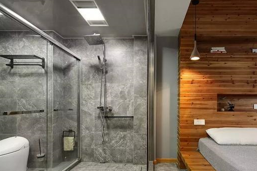 卫浴空间在色彩表达上和谐统一,由卧室地面的灰白色瓷砖延伸而来,干净利落。