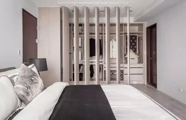 卧室这么小,隔断怎么做?我们可以用房间里的家居巧妙充当隔断,例如衣柜、书桌、书柜等等。如果想要更加宽阔的视野,也可用收纳架、屏风、玻璃等增加卧室空间感和层次感。